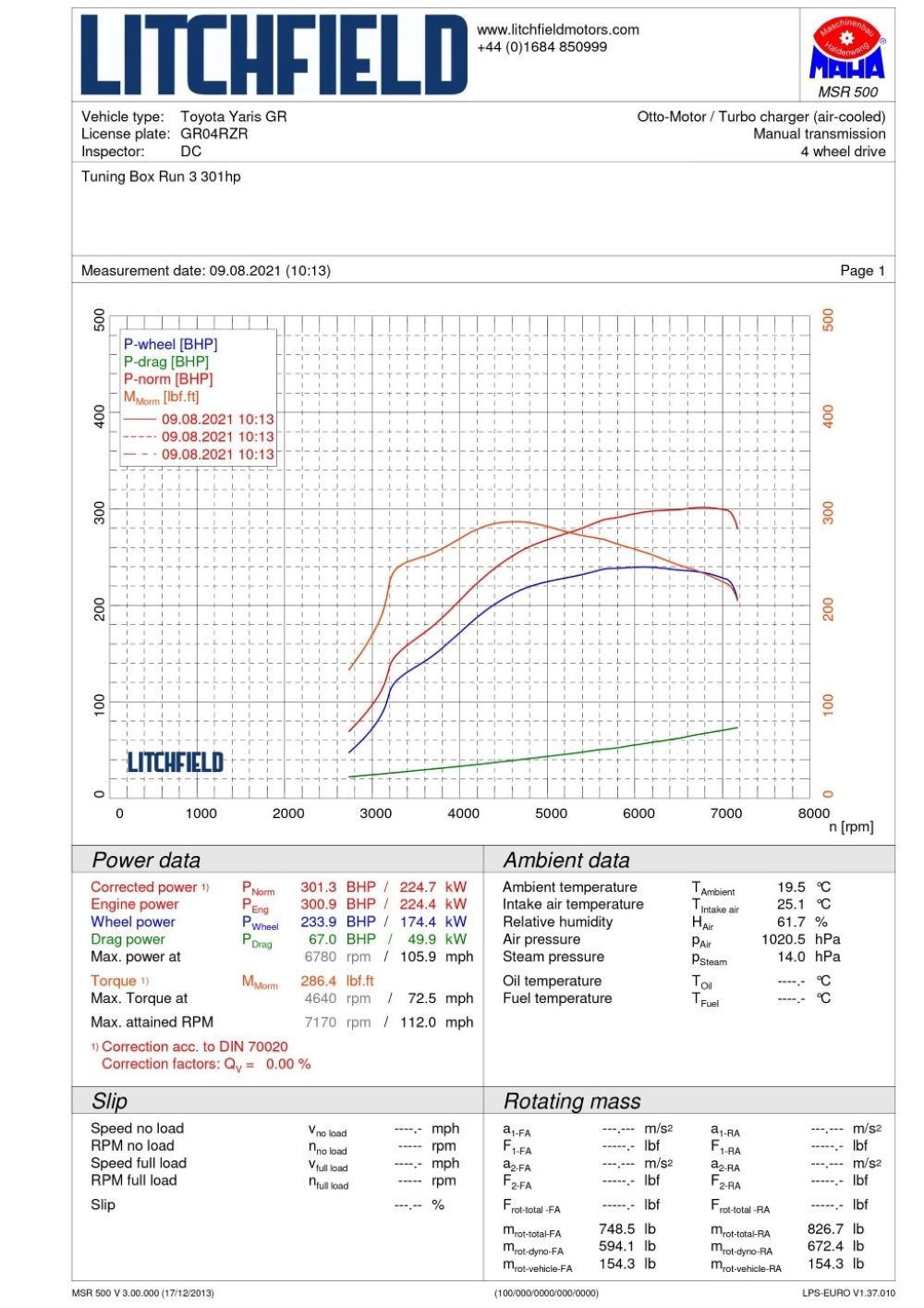 Testing was completed in the UK on a Yaris GR atĀ Litchfield’sĀ MahaĀ dyno,Ā manufactured by the same people who currently supply BMW M Sport and MercedesĀ Benz forĀ allĀ their engine calibration and dyno testing. The vehicle used for testing had a full turbo back exhaust along with a DT UK Tuning box. Our first run with an ambient air temperature of 19.5°C, gave results of 301.3 BHP and 286.4 lbs/ft of torque. Later after the 3rdĀ pull on the dyno, the inlet air temp quickly increased to nearly 58°C, with the BHP and torque both decreasing to 295bhp and 278 ft/lbs.Ā