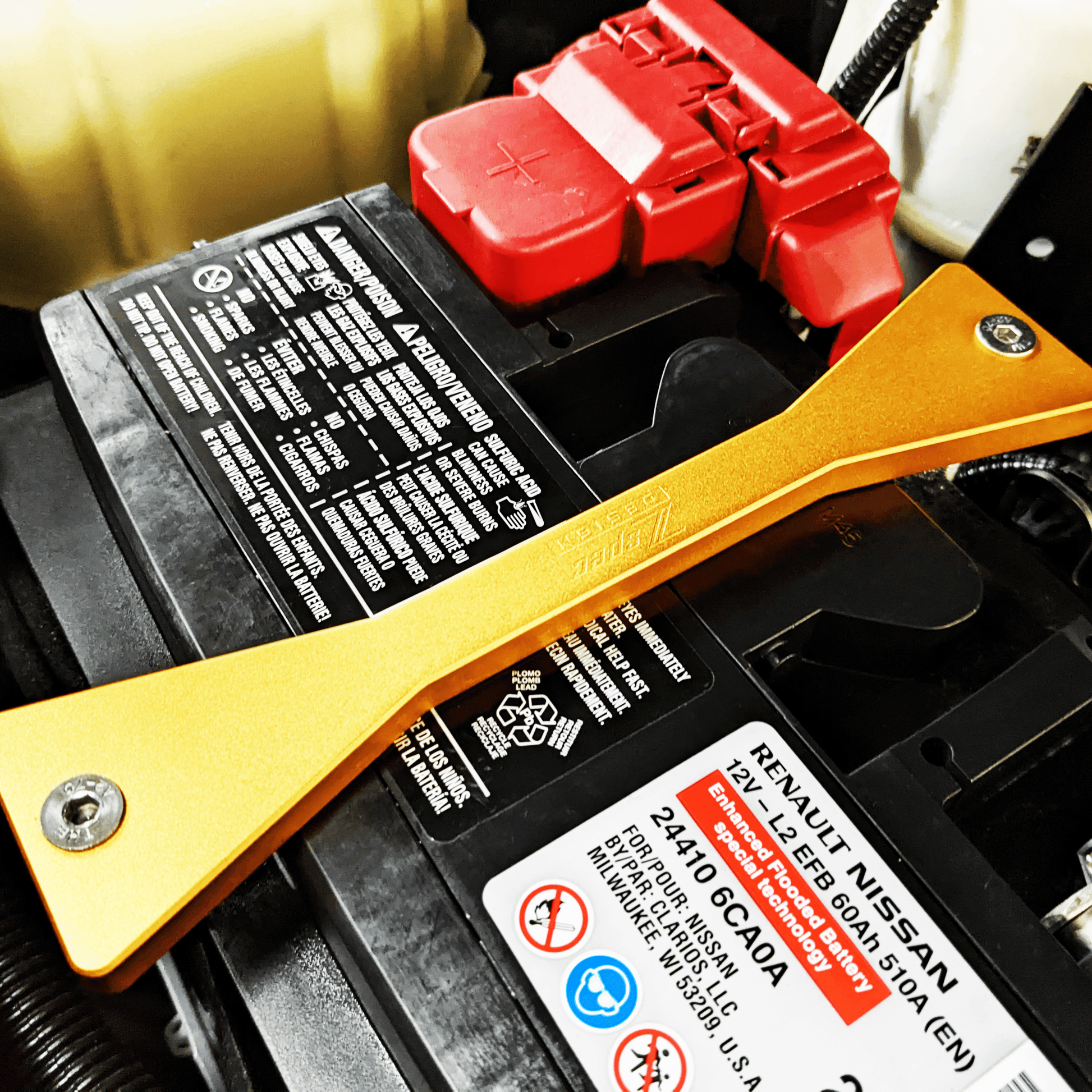 ZSPEC has an answer for those ugly factory battery brackets. The ZSPEC battery hold-down kit for the D41 Frontier replaces the top steel bracket and J-hooks for better aesthetics.Â