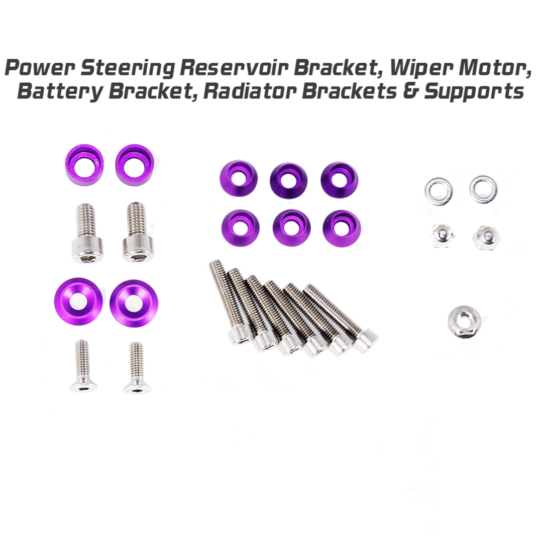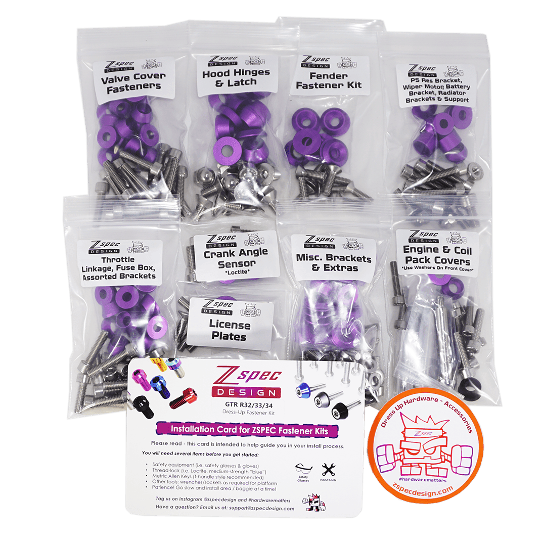 ZSPEC's 290-Piece Stage-3 Engine Bay Kit for the Skyline GT-R/GTR R32, R33, and R34 includes top-quality stainless steel fasteners and your choice colors for the billet-aluminum finish washers.