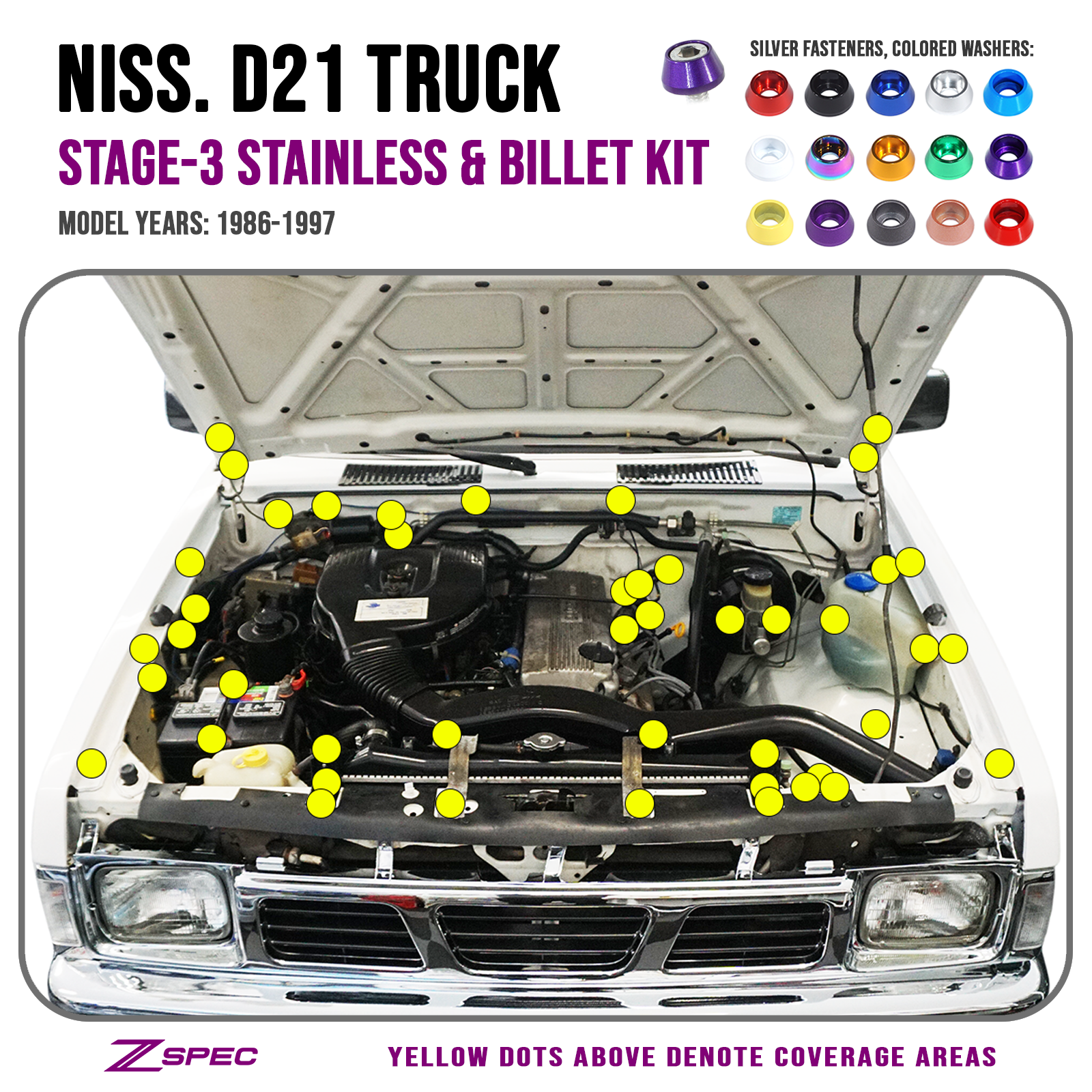 The ZSPEC Stage-3 Fastener Kit for the Nissan D21 Hard-Body Truck includes 198 pieces of hardware. The Hardware in the kit is comprised of silver stainless steel fasteners coupled with our colored billet-aluminum finish washers.