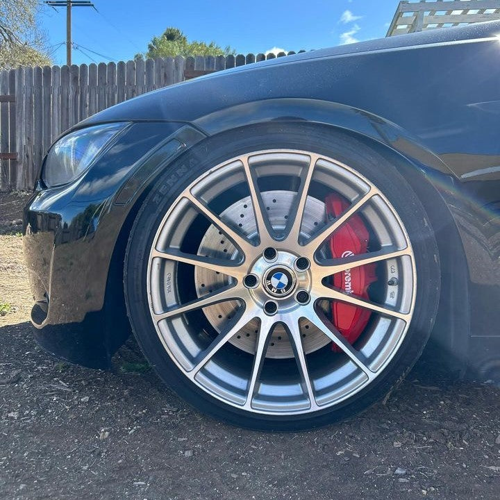 This bracket kit allows you to bolt on Mustang GT350 6 piston Brembo calipers along with 380mm F80 M3/M4 brake rotors onto your E90, E92, or E93 BMW M3. With GT350 calipers costing less than $300 per side brand new and aftermarket F80 M3 rotors costing around $100 each, the entire front brake setup can be completed for less than $1200 making this the best big brake kit available for the money for your E9X BMW M3.