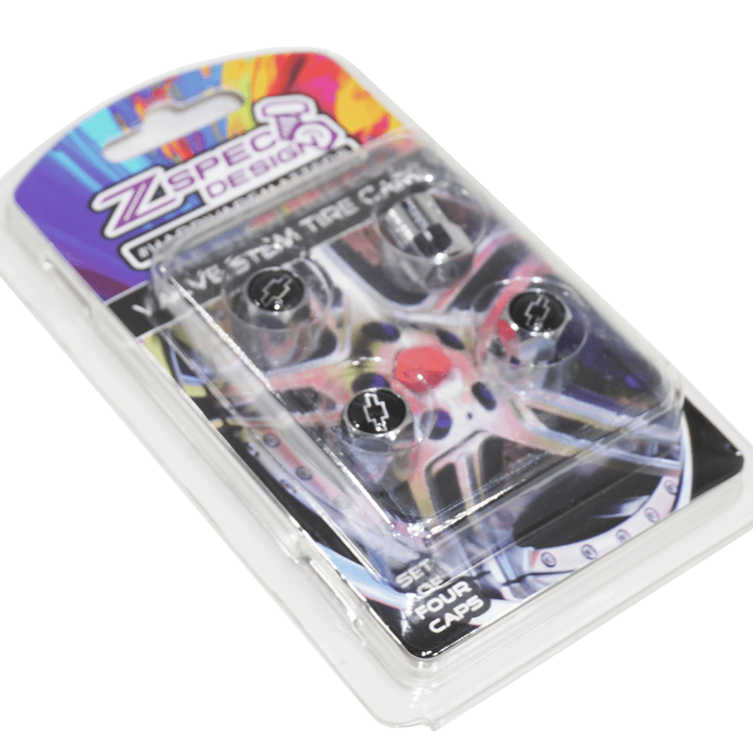 Chrome Valve Stem Tire Caps, Style: Chevy, Black & Chrome Bow-Tie