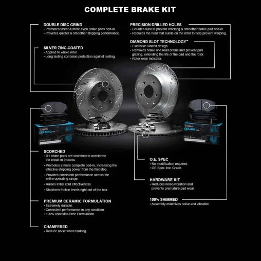Cross-Drilled and Diamond Slotted Brake Rotors.Provides the maximum benefits in stopping power, durability, and performance.