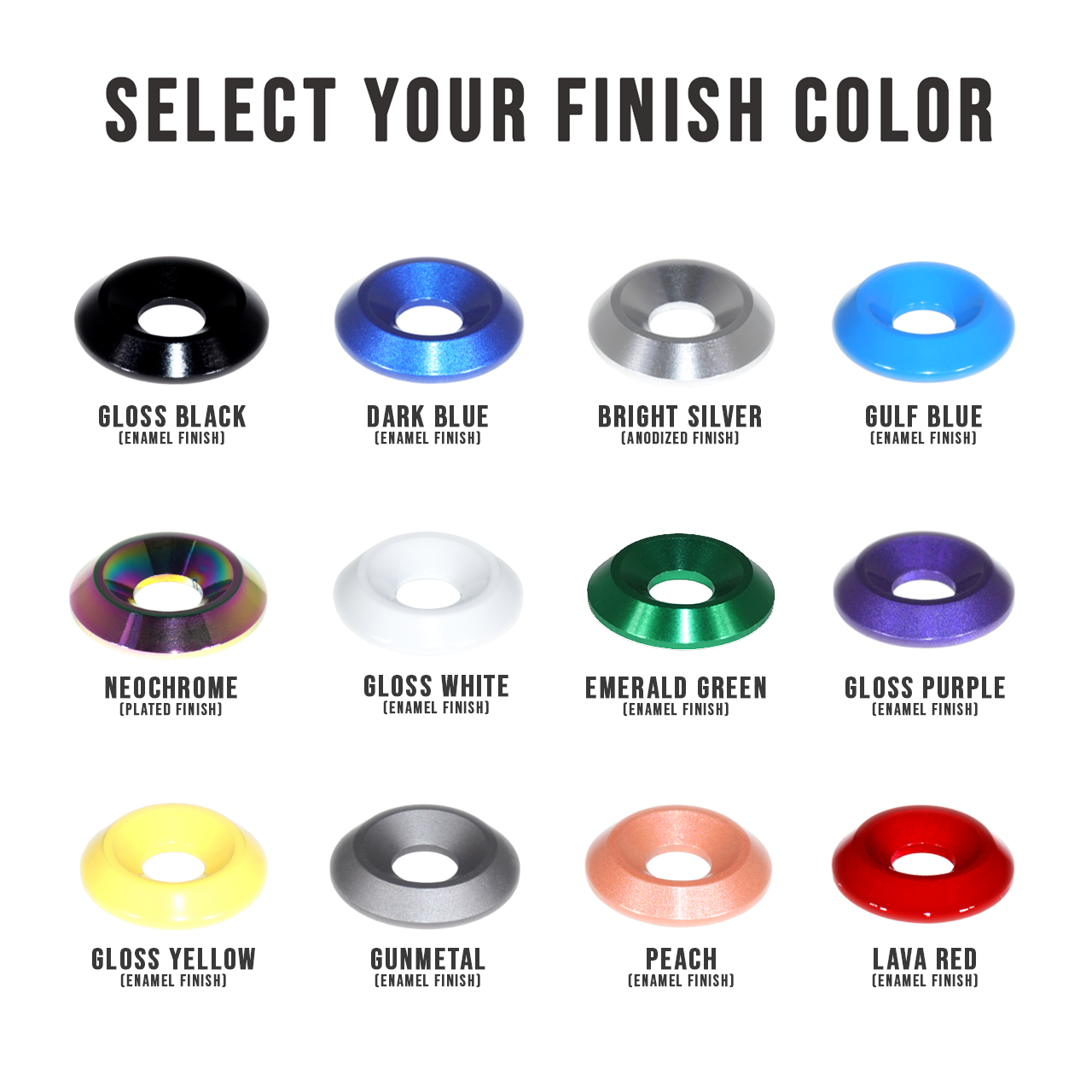 The hardware kit utilizes naturally bright silver 304 Stainless fasteners and colored finish washers.  For the body and bumpers, a mix of Rubber Well Nuts and Rivet Nuts are included.  Well Nuts in the kit are utilized for the plastic bumper body elements on the car, whereas Rivet Nuts should be utilized on the metal "hard" panels for long-lasting durability.