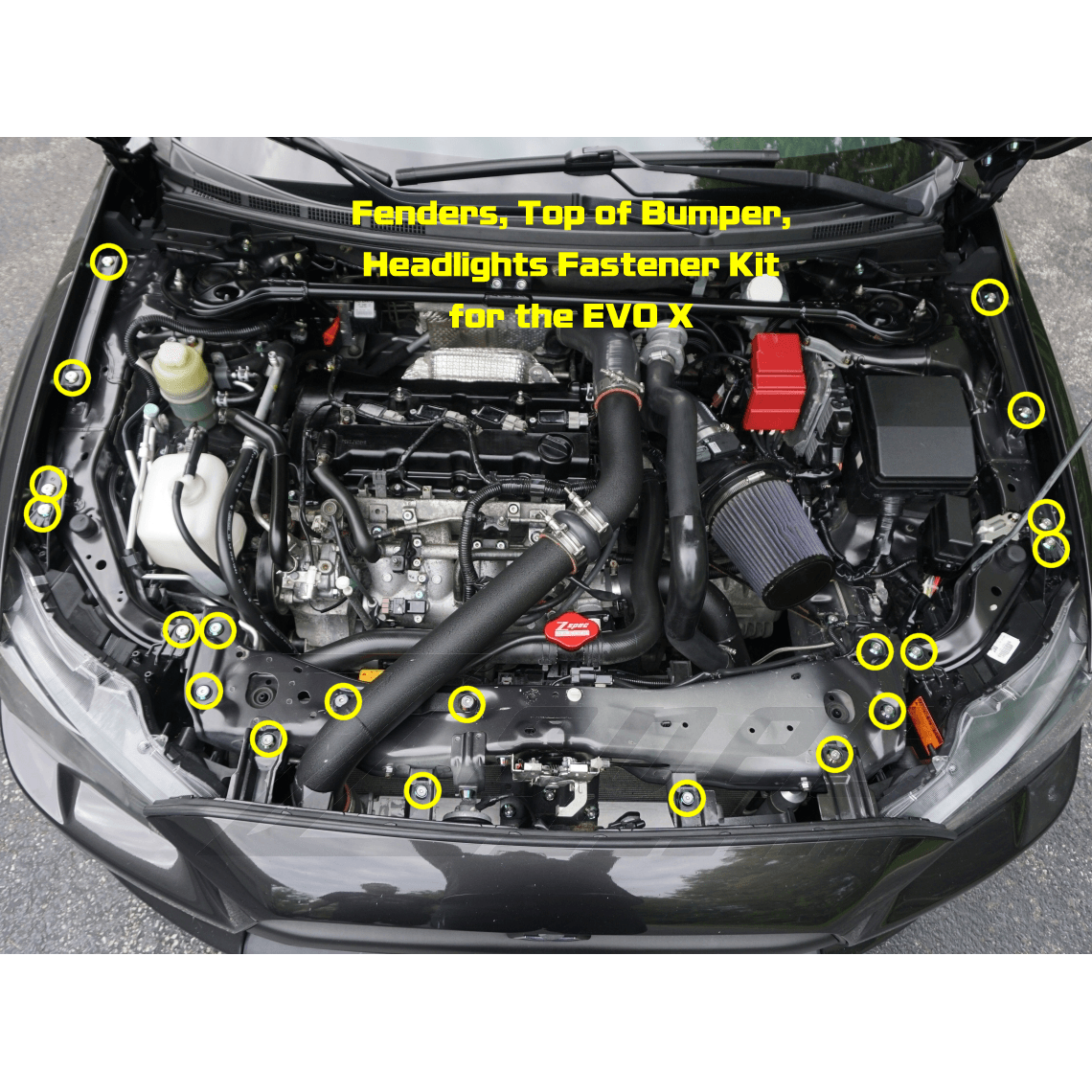 Fastener Kit for the EVO X "Fenders, Headlights and Top of Front Bumper". This kit fits all EVO X models.