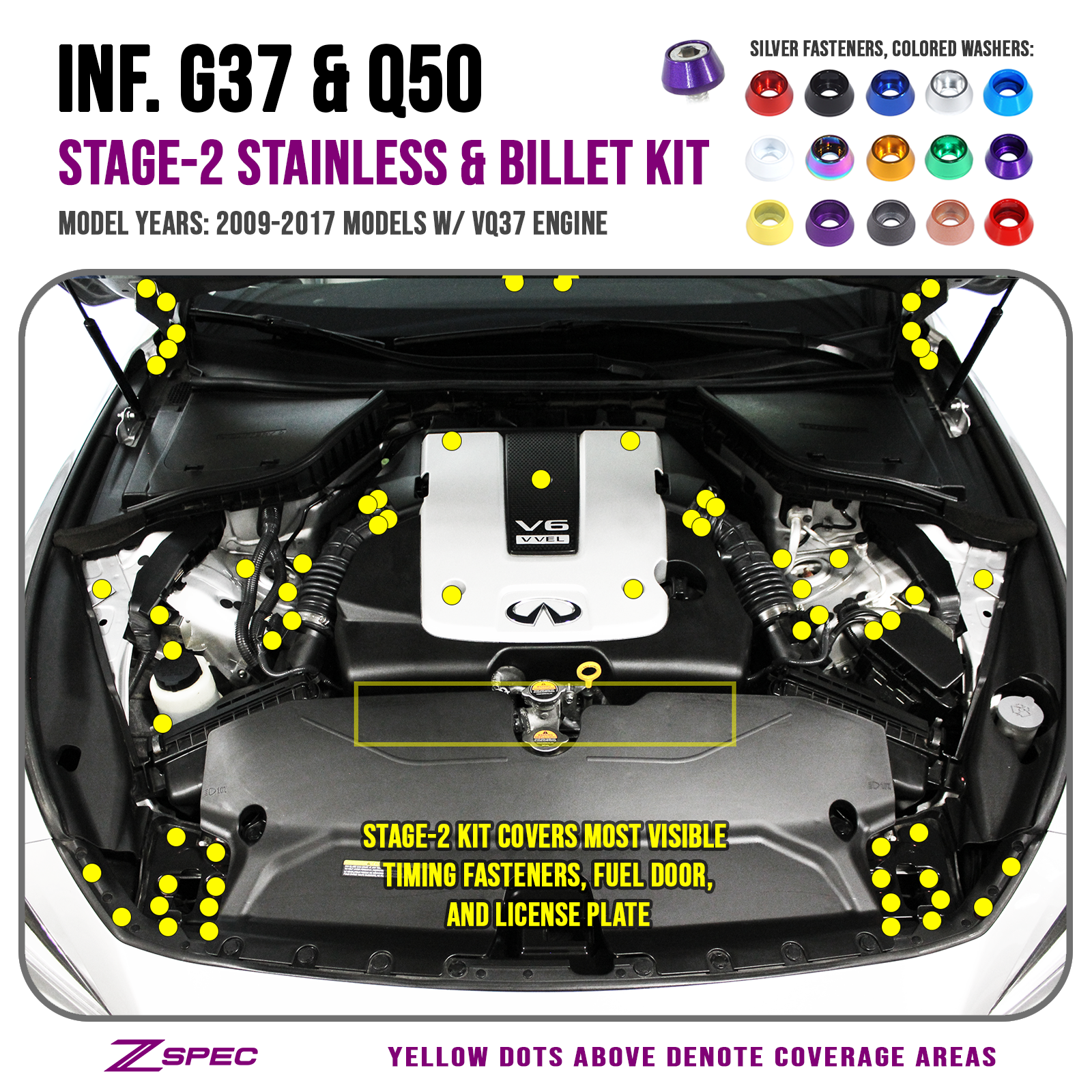 ZSPEC "Stage 2" Dress Up BoltsĀ® Fastener Kit for '09-'17 Infiniti G37/Q50 VQ37, Stainless & Billet