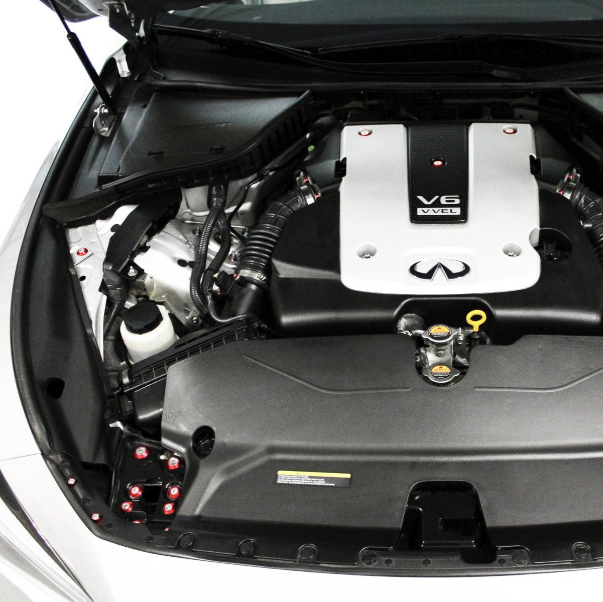 The ZSPEC Stage-2 Engine Bay Kit for the G37/Q50 (VQ37-based) platforms cover a wide variety of the visible fasteners in the engine bay.