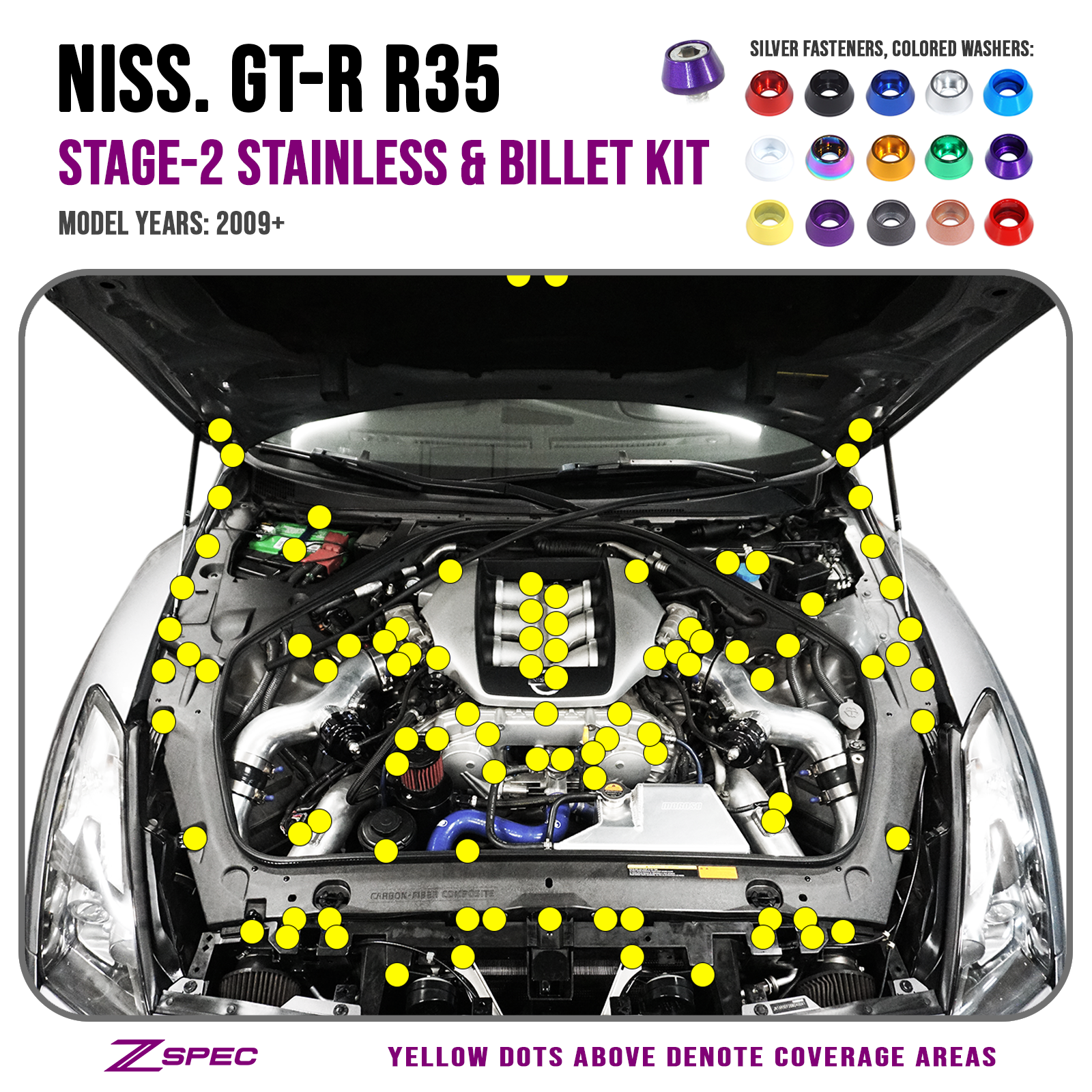 ZSPEC Stage-2 Dress Up BoltsĀ® Fastener Kit for '09-23 Nissan GTR (R35) includes over 300 pieces of hardware. Fasteners are top-quality A2 Stainless Steel and the kit is offered with your choice of billet-aluminum ZSPEC-designed colored finish washers.