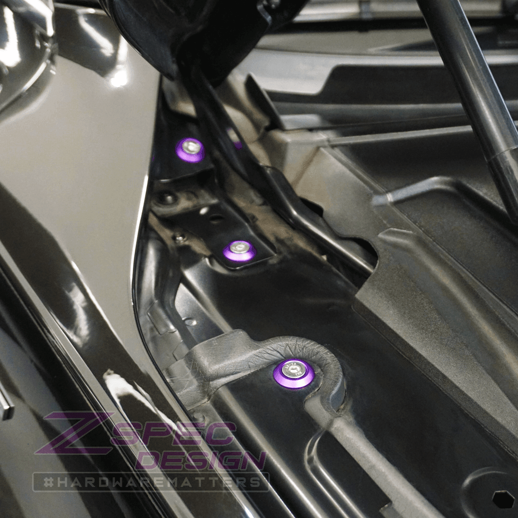 The kit's fasteners areĀ SUS304 Stainless Steel and colored finish washers are billet-aluminum.Ā ZSPEC Stainless-Billet fastener kits provide the deepest coverage and value while providing a clean updatedĀ appearance.