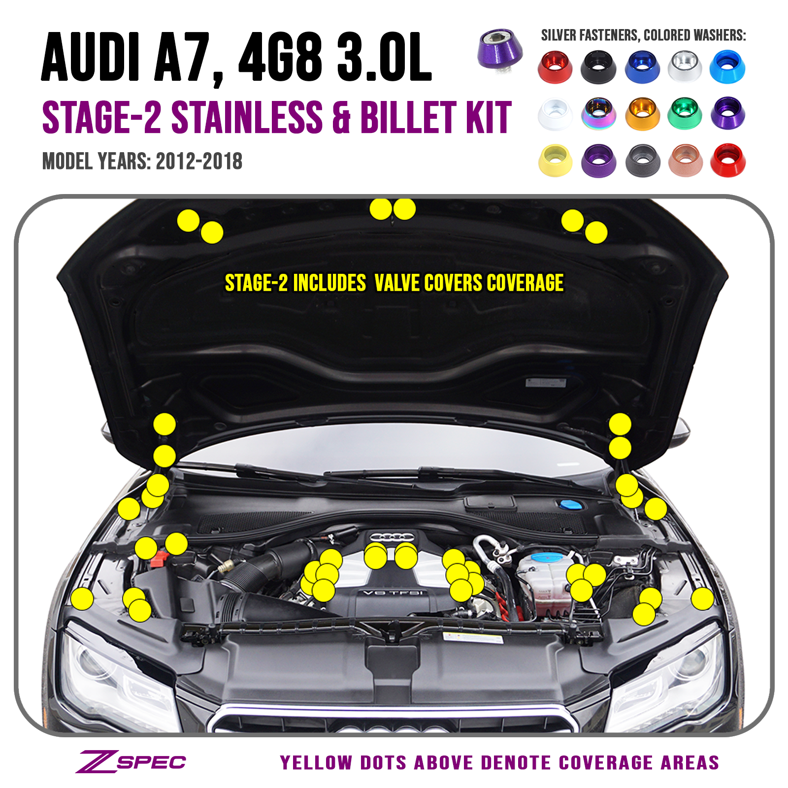 ZSPEC "Stage 2" Dress Up BoltsĀ® Fastener Kit for '12-18 Audi A7 4G8 3.0L, Stainless & Billet
