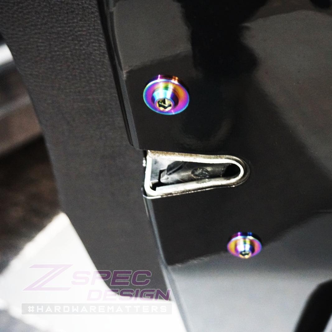 The kit's fasteners are Grade-5 (GR5) Titanium, known for it's lightweight and anti-corrosion properties. Titanium weighs in at ~40-45% of the OE fastener weight while providing an incredible appearance.