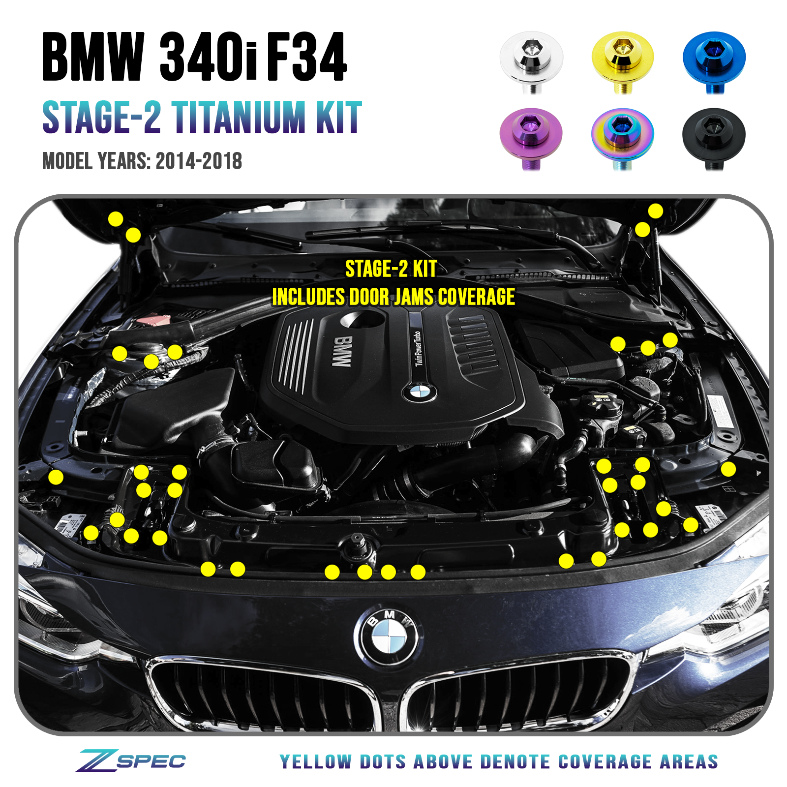 ZSPEC "Stage 2" Dress Up BoltsĀ® Fastener Kit for '14-18 BMW 340i F34 is a 100-piece dress-up hardware kit providing show-quality replacements.