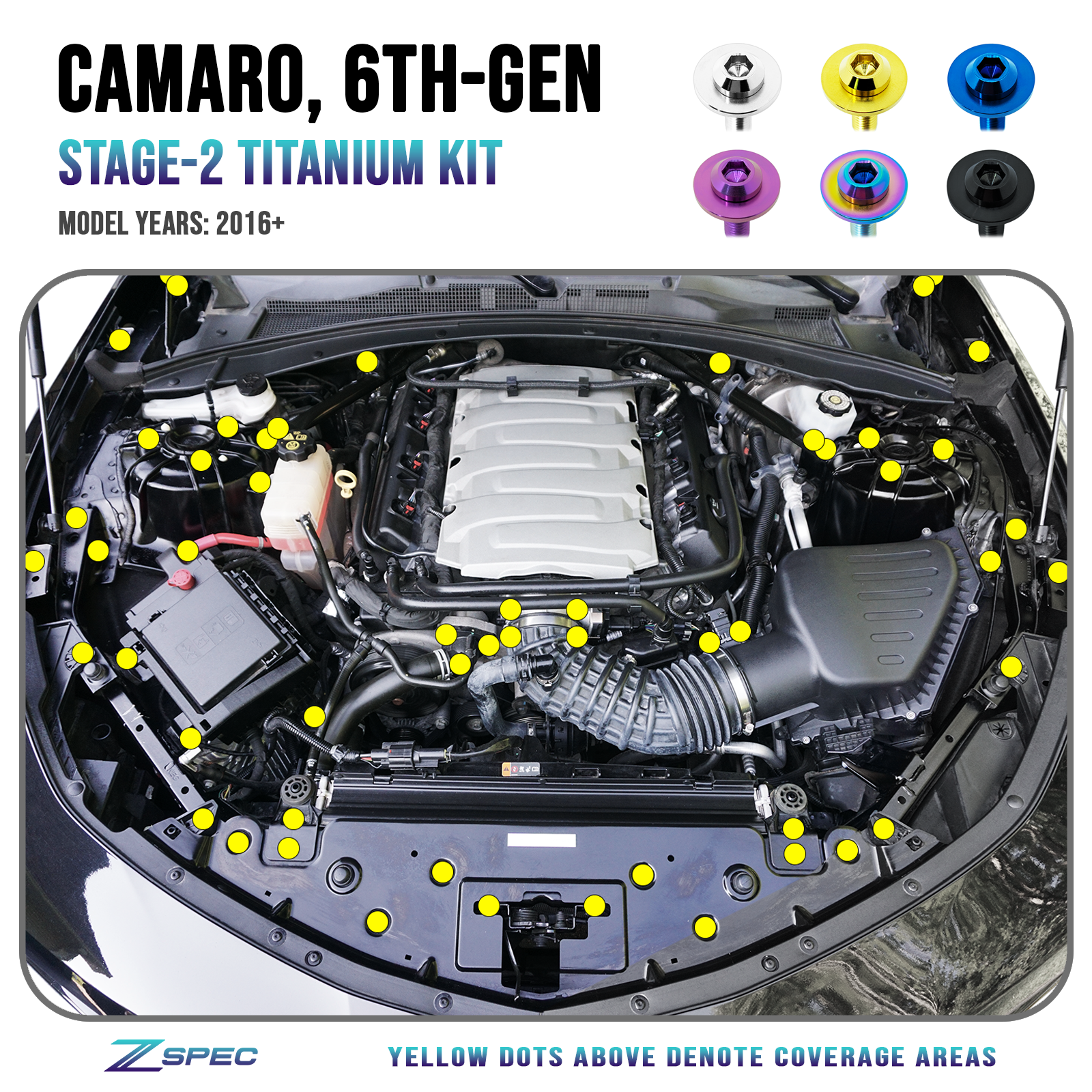 The ZSPEC Stage-2 Engine Bay Fastener Kit for the Chevrolet Camaro SS V8 platform is a 170-pieceĀ hardware solution. The kit is comprisedĀ grade-5 (GR5) titanium show-quality hardware.