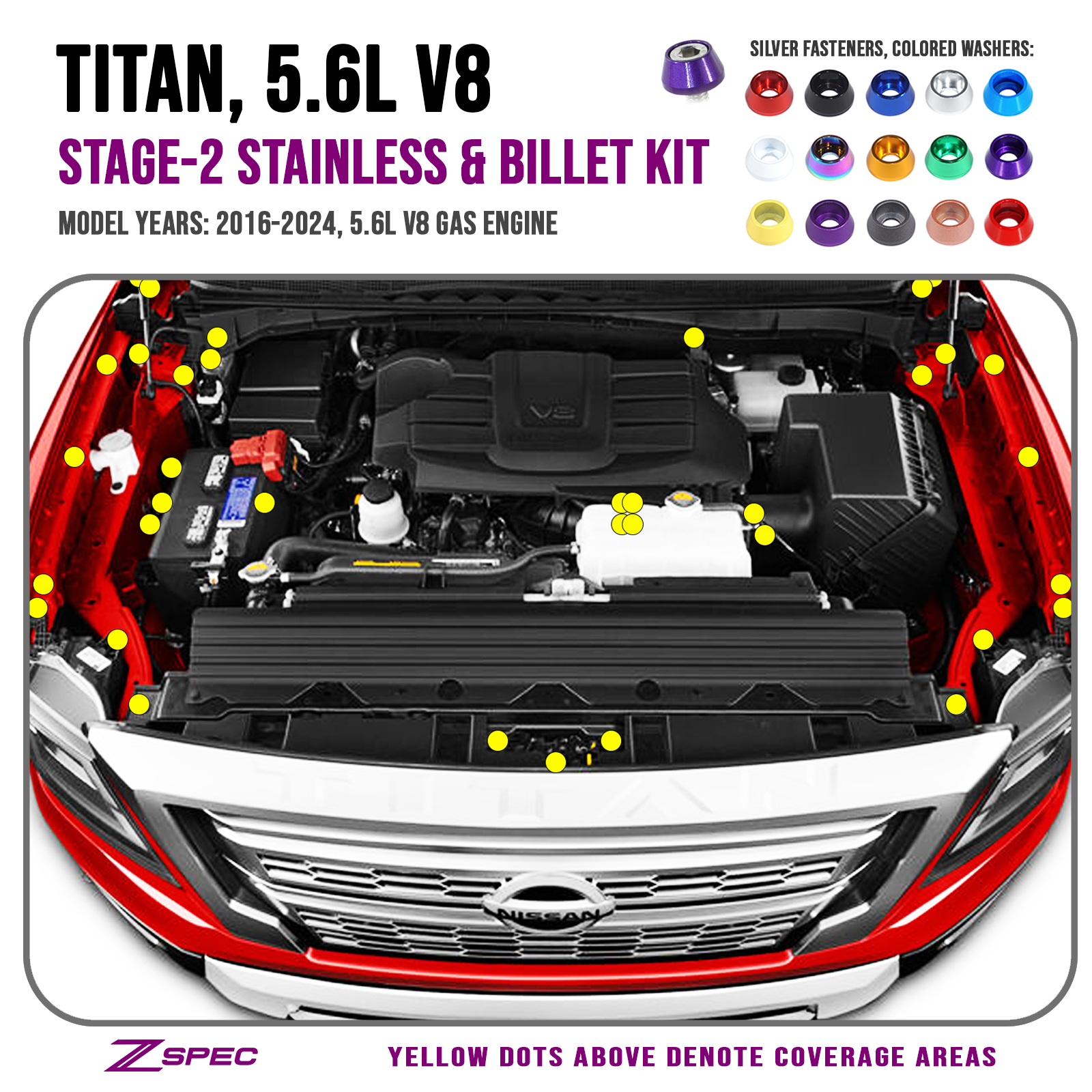 The ZSPEC Stage-2 Dress-Up Fastener Kit for the '16-24 Titan 5.6L V8 Models consists of approximately 161 pieces of hardware - stainless fasteners (silver) and your choice of vibrant billet-aluminum finish washers.