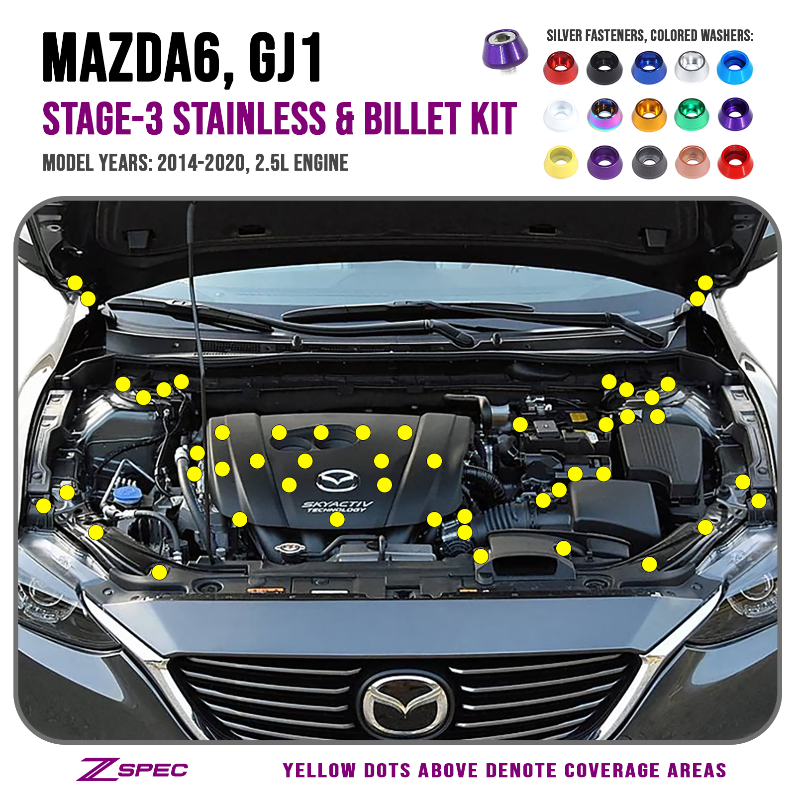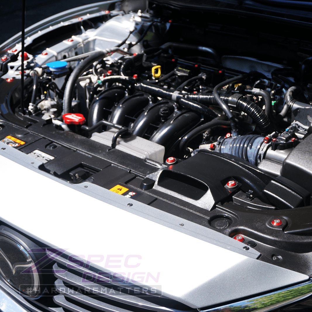 ZSPEC's Stage-3 Dress-Up Fastener Kit for the Mazda6 2.5L (2014-2020) is a vehicle-specific 210-piece hardware kit utilizingĀ silver-colored stainless fasteners and colored billet finish washers.