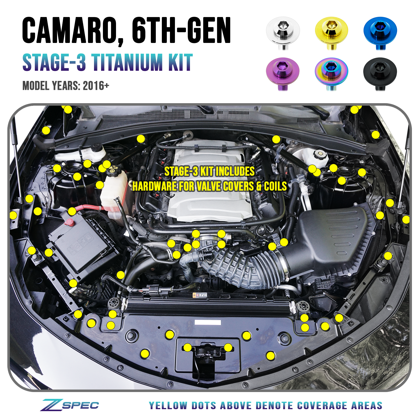The ZSPEC Stage-3Ā Engine Bay Fastener Kit for the Chevrolet Camaro SS V8 platform is a 220-pieceĀ hardware solution. The kit is comprisedĀ grade-5 (GR5) titanium show-quality hardware.