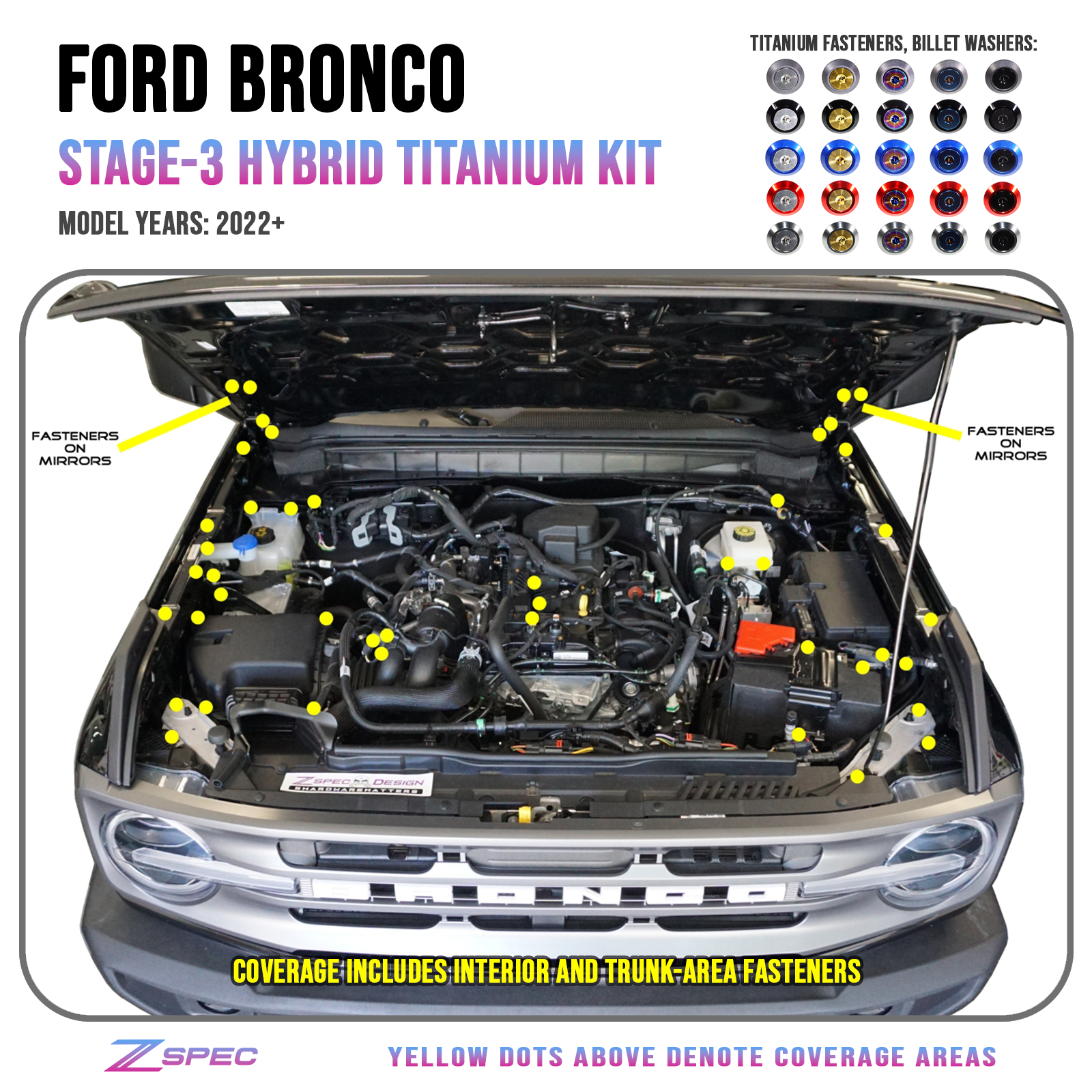 ZSPEC "Stage 3" Dress Up BoltsĀ® Fastener Kit for 21+ Ford Bronco 2.7L, Titanium & Billet