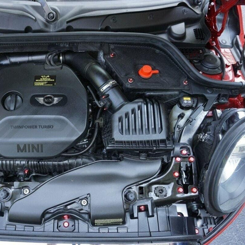 The ZSPEC "Stage-3" Engine Bay Fastener Kit for the Mini Cooper S F-Chassis (F55/56/57) is ~150 pieces. The kit is comprised of top quality fasteners and our ZSPEC-designed billet-aluminum colored washers.