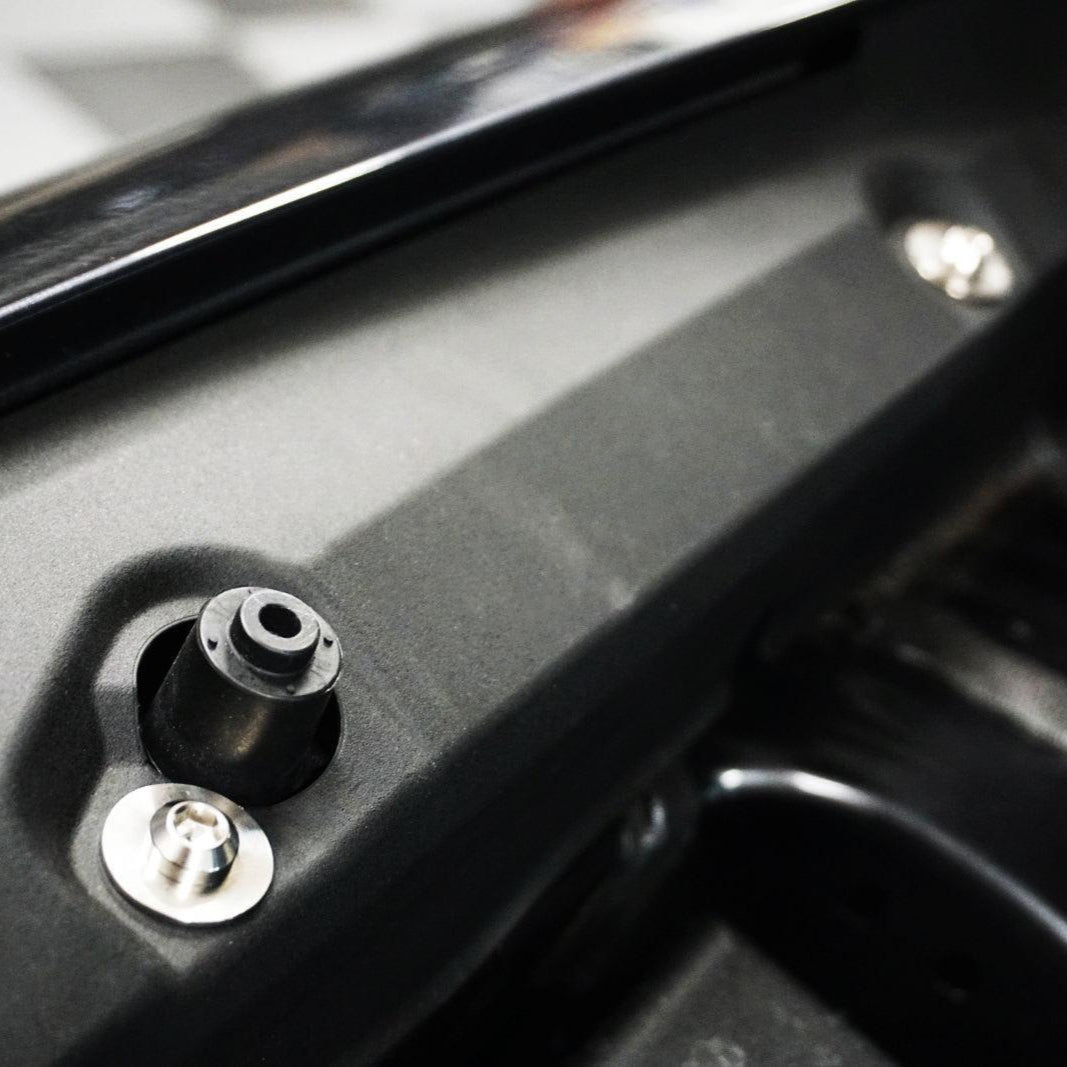 The Factory Plastic Clips break easily and are often chipped up or missing over time.  Upgrade your engine-bay's look with ZSPEC's lightweight GR5 Titanium hardware solution leveraging rubber well nuts.