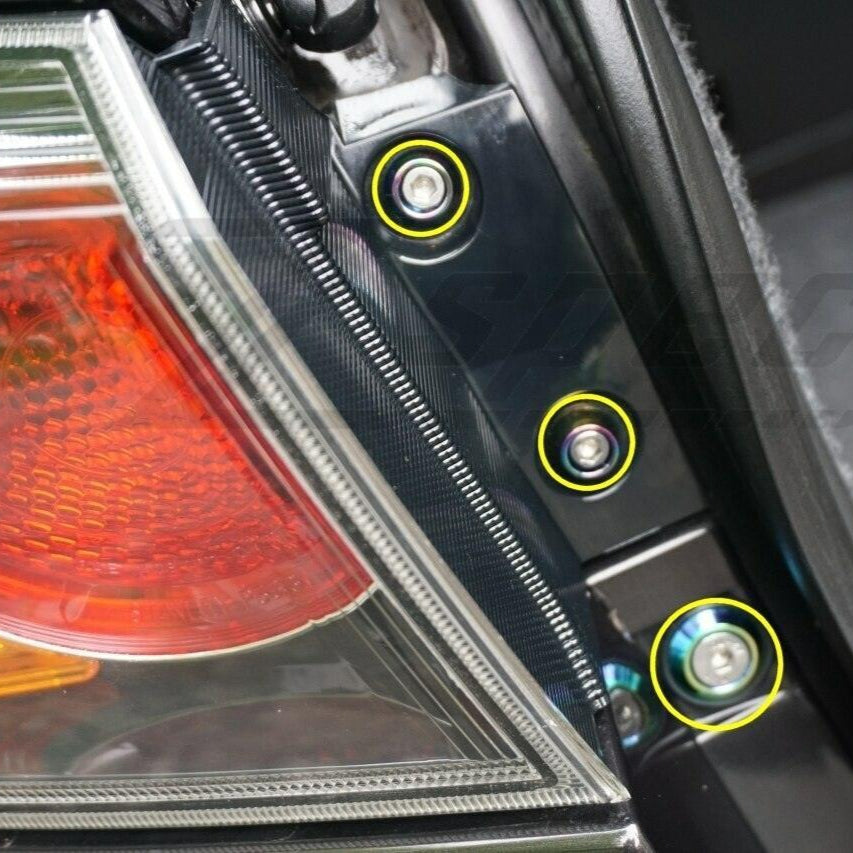 This kit fits all EVO X models and replaces the fasteners for the Trunk Lid Hinges, Wing Fasteners (connecting wing to Trunk lid) and Tail Lights